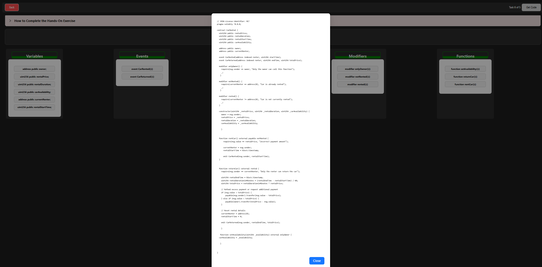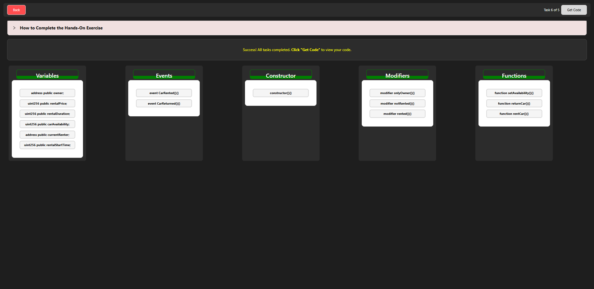 After successfully completing the Hands-On activity, click the Get Code button to view and download the solution code.After clicking the Get Code button, view the complete final code of your Solidity program.