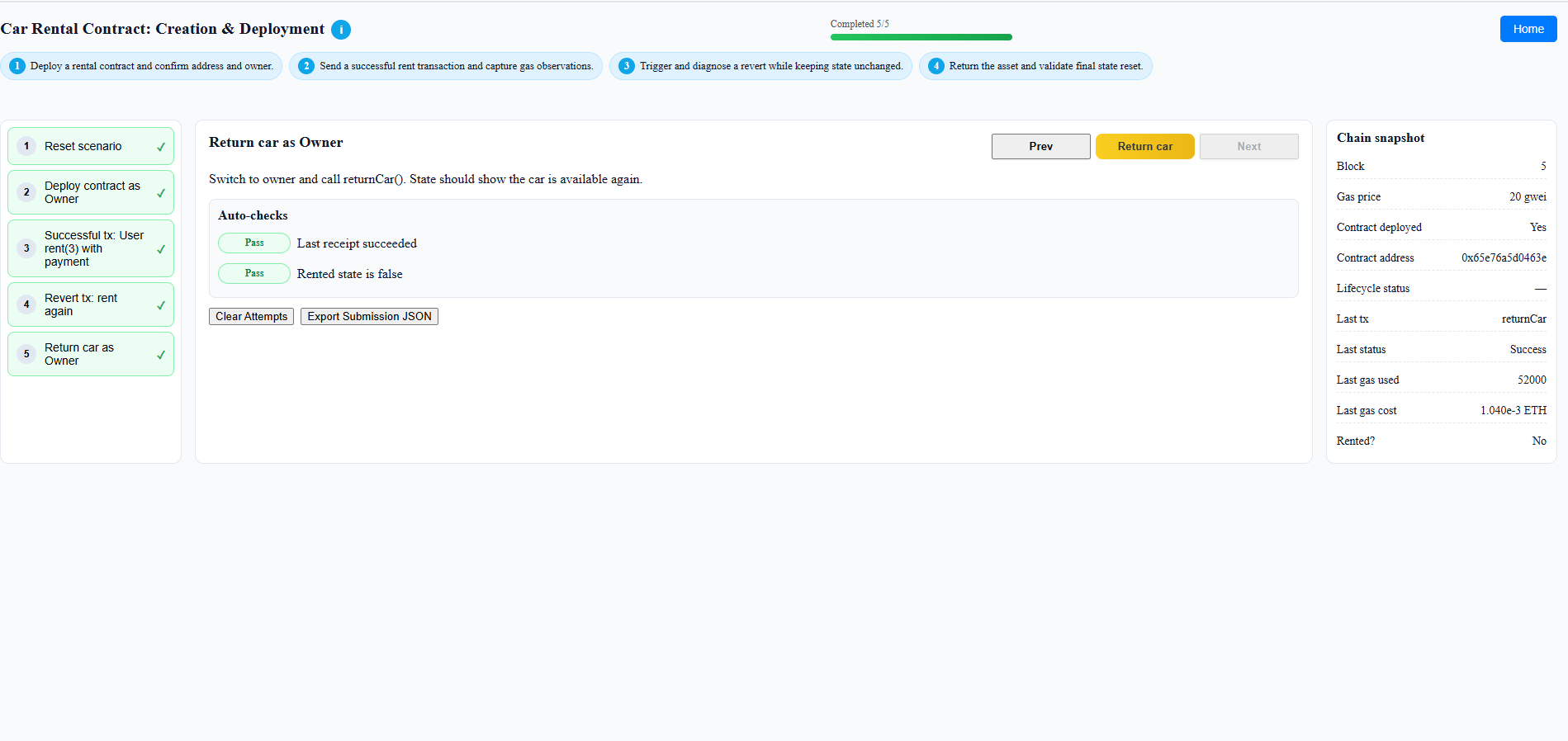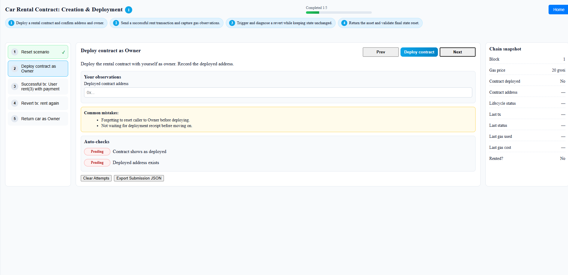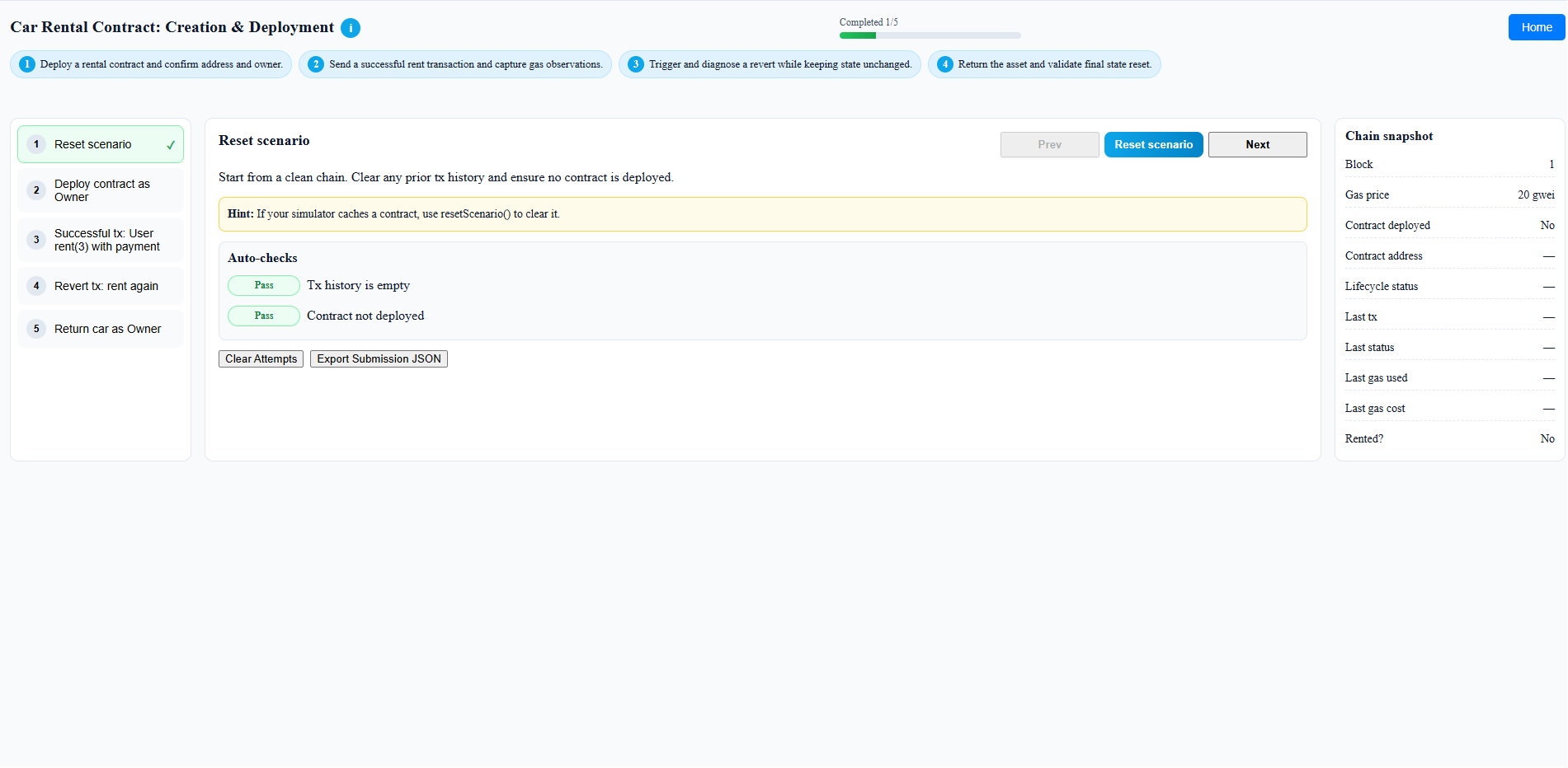 Step 2: The simulation will start with the Car Rental Contract: Creation & Deployment worksheet. The first step is to Reset scenario. Click the Reset scenario button to start from a clean chain.