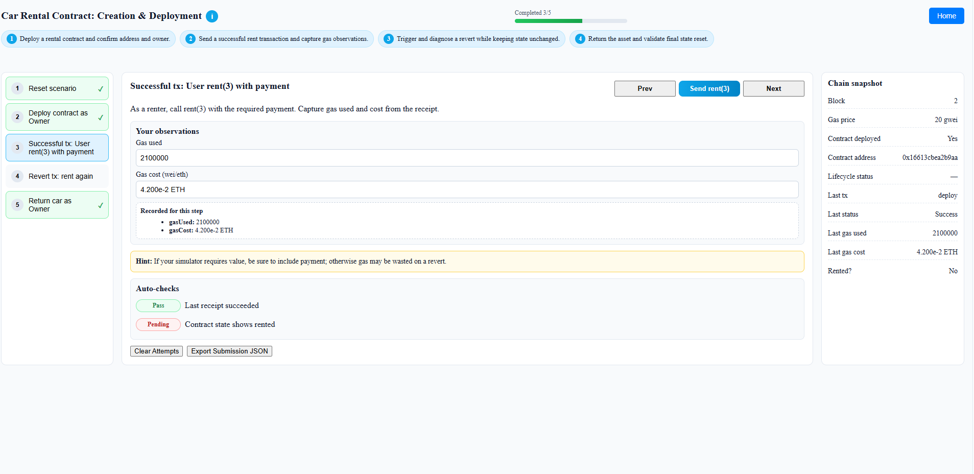 This simulation introduces the Solidity compiler through guided tasks designed to teach fundamental programming concepts, including conditional statements (if-else), looping structures, and data organization using structs (which provide object-like behavior in Solidity). Participants will also complete a practical Hands-On Exercise based on a Car Rental Smart Contract.
