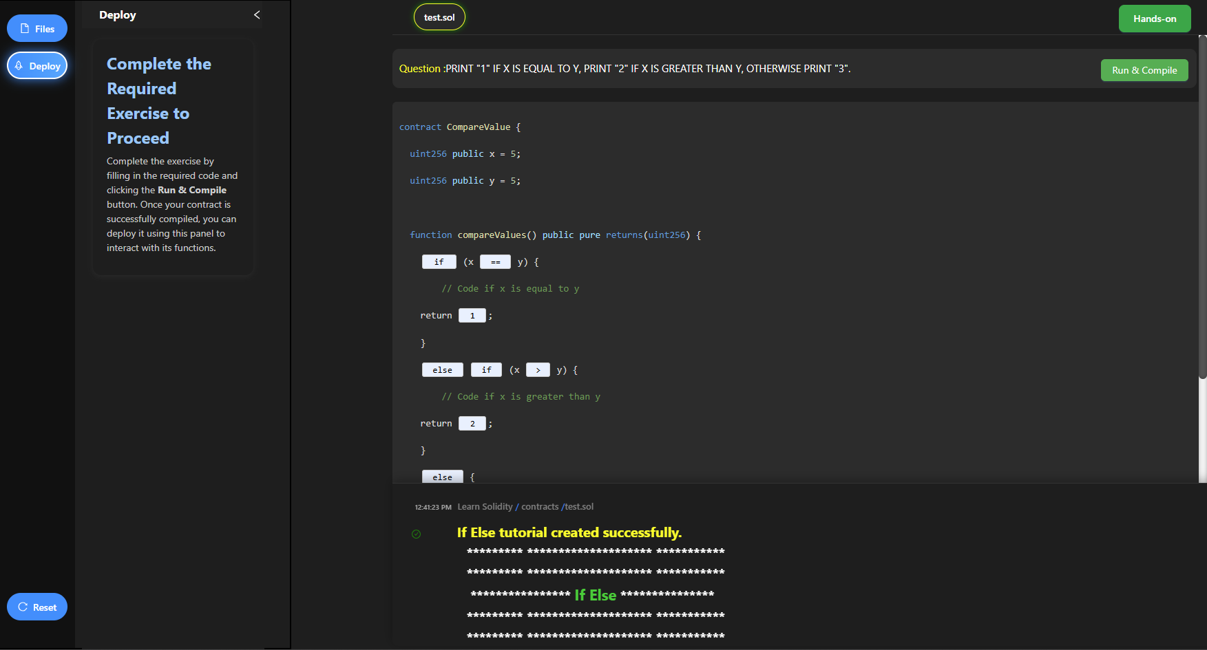 You have successfully completed the Solidity simulation experiment. From creating a new file, learning important concepts, deploying contracts, to completing the Hands-On section and viewing the final code — the procedure is now complete.
