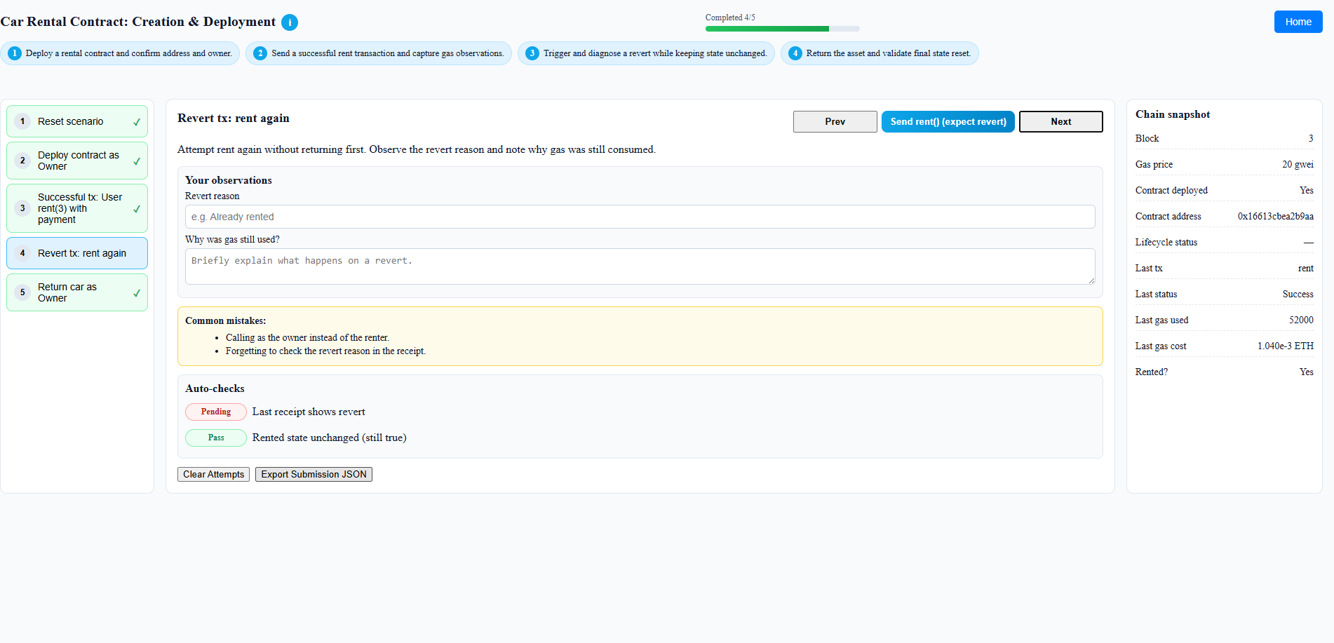 Step 5: The next step is to make a Revert tx: rent again. Click the Send rent() (expect revert) button to attempt to rent again without returning first. Observe the revert reason and note why gas was still consumed.