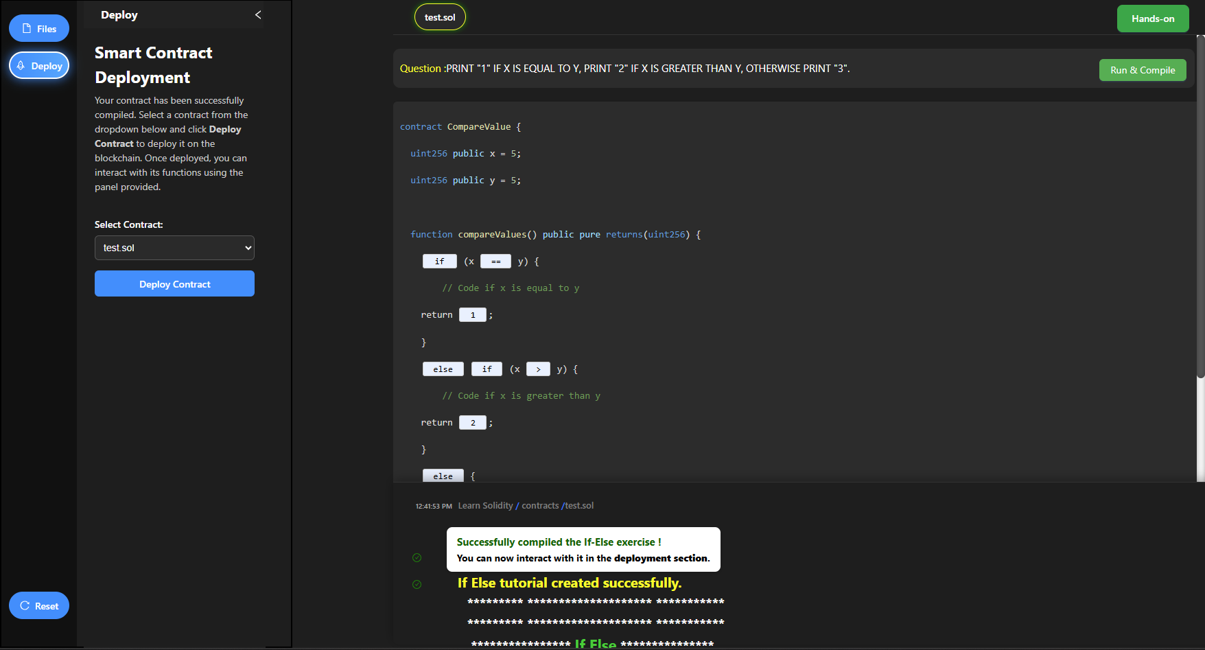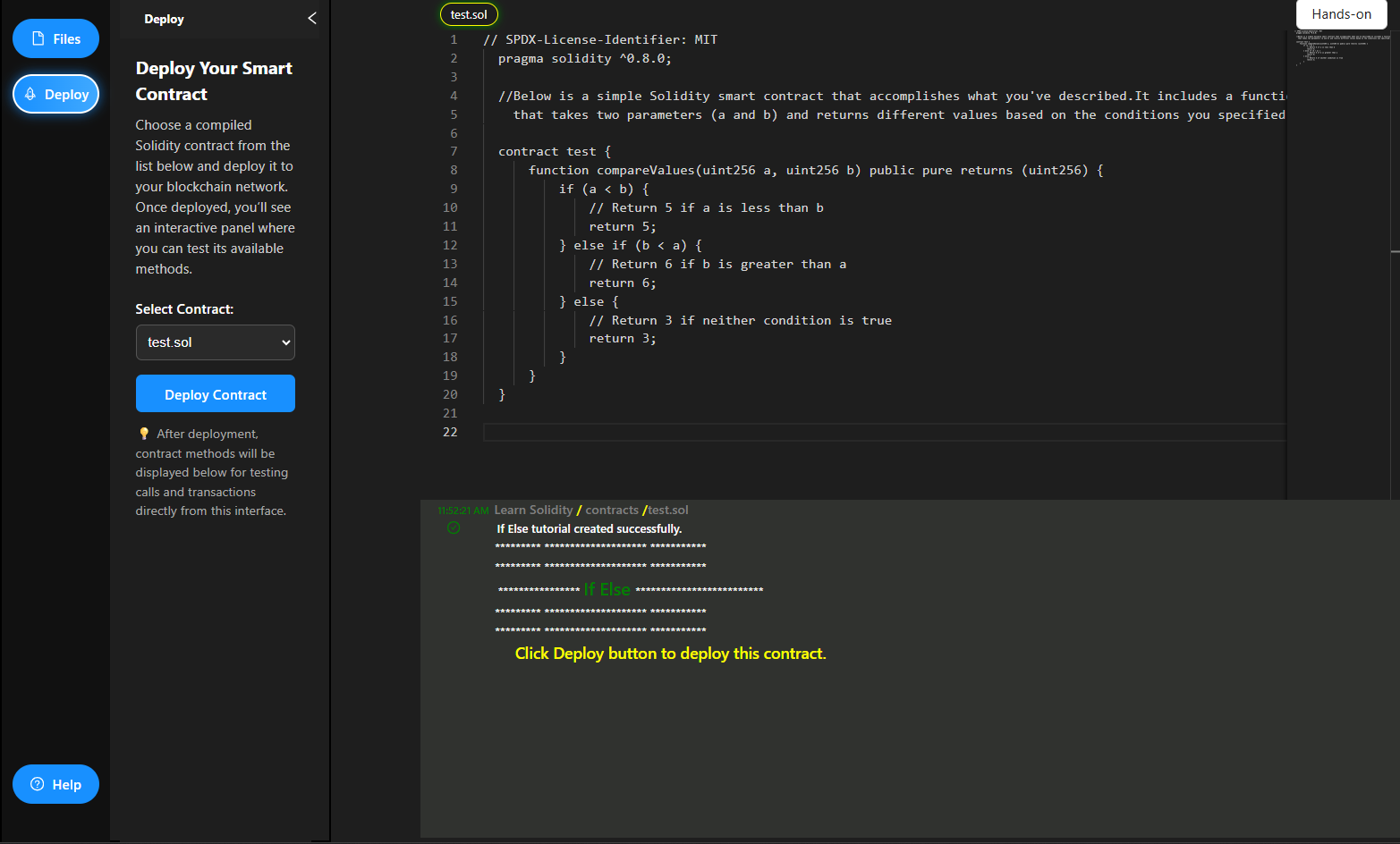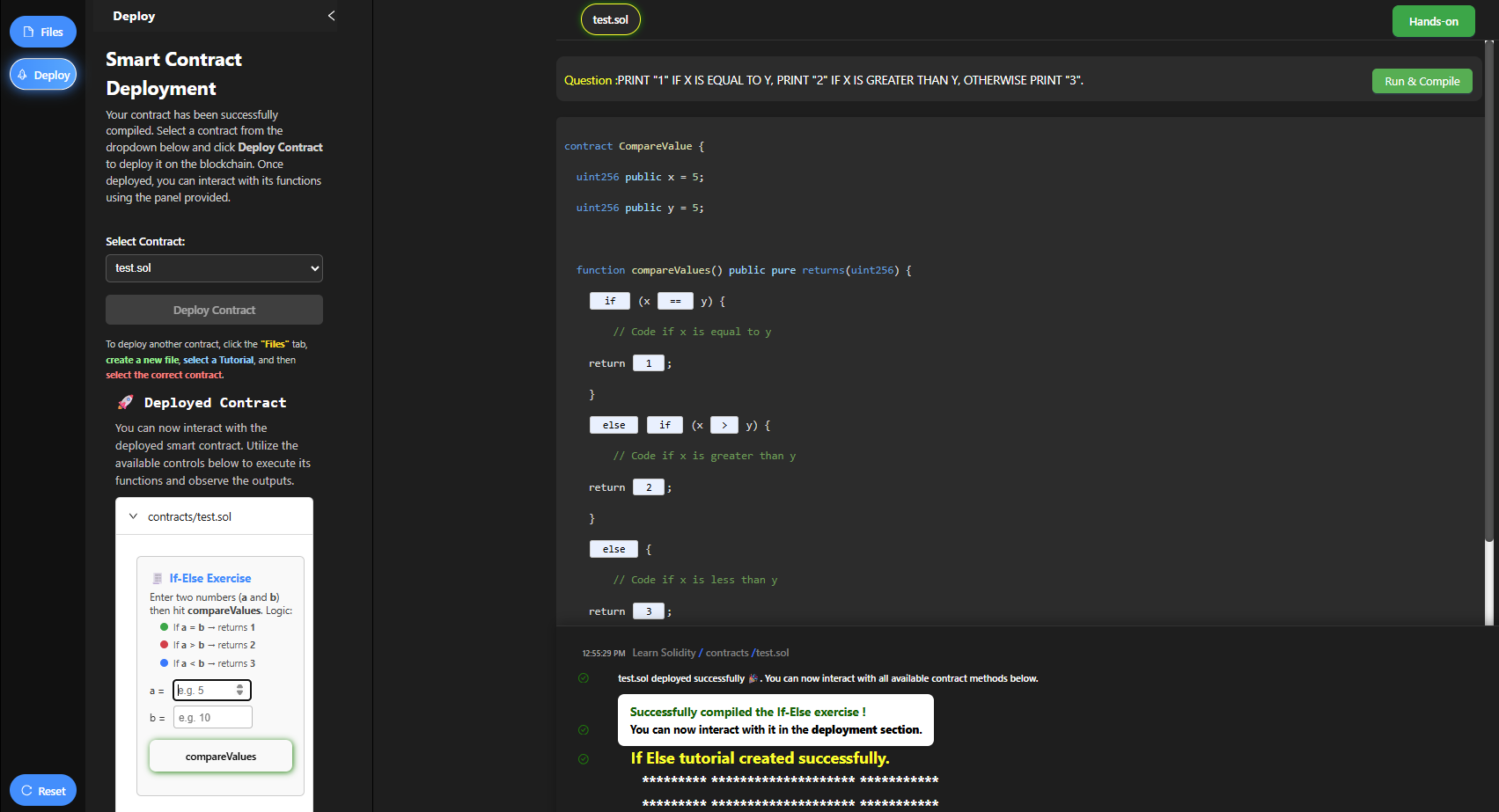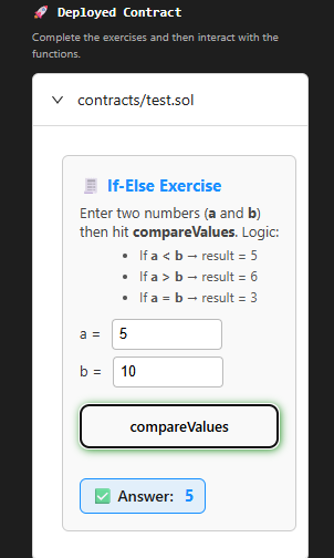 Step 6: After deployment, the If-Else Exercise will be shown inside the Deployed Contract panel. Enter two numbers (a and b), then click compareValues to test the contract logic.