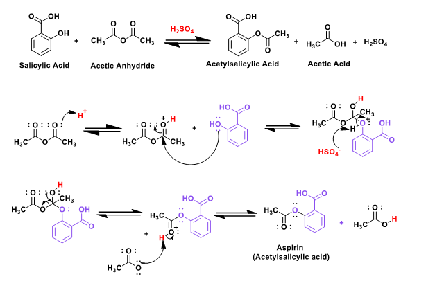 - Add 2.7 equivalents of acetic anhydride (Mol. Wt. 102.08 g/mol) using a measuring cylinder to the salicylic acid. Add 7-8 drops of concentrated sulfuric acid and stir until all salicylic acid is dissolved.