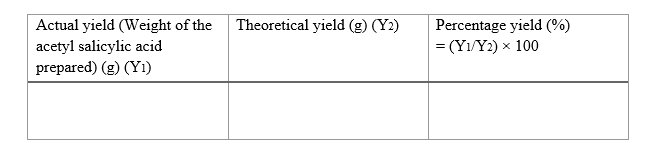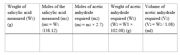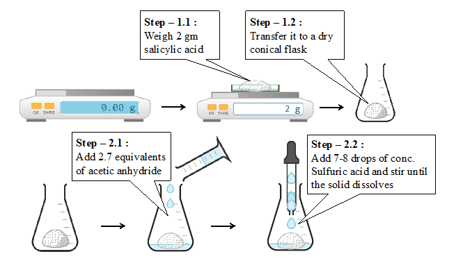 - Weigh 2.0 g of salicylic acid (Mol. Wt. 138.12 g/mol) in a watch glass and transfer it to a dry 150 ml conical flask.