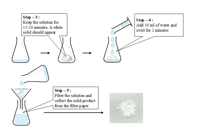 - Dissolve the crude product in 7 ml ethanol in a beaker and add 15 ml of distilled water. Heat on water bath till you get a clear solution.