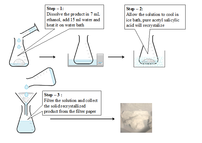 - Allow the solution to cool in an ice bath without disturbing. Pure acetylsalicylic acid crystalizes.