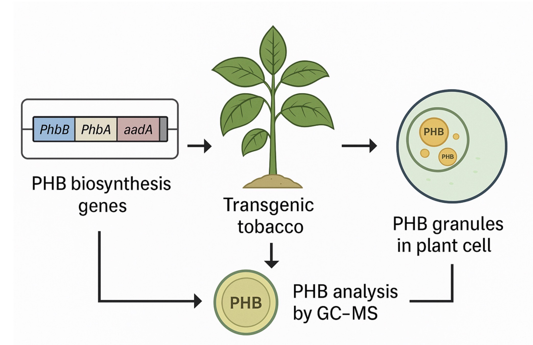 - The bacterial genes phaA, phaB, and phaC were selected and codon-optimized for tobacco plastids.