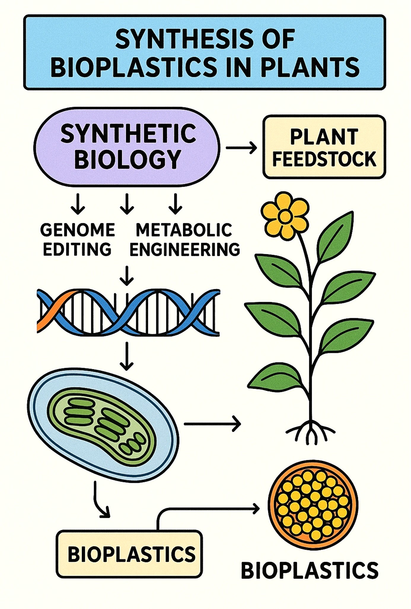 Synthetic biology in plants for bioplastic manufacturing is an innovative approach that use engineering concepts to reconfigure plant metabolism, thereby producing biodegradable and sustainable alternatives to petroleum-derived polymers. Plants serve as optimal hosts due to their renewability, scalability, and inherent ability to sequester carbon via photosynthesis. The primary emphasis has been on developing engineering paths for polymers, including polyhydroxyalkanoates (PHAs) and polylactic acid (PLA), alongside the enhancement of native polymers such as starch and cellulose for plastic manufacturing. Bacterial genes (phaA, phaB, phaC) have been incorporated into Arabidopsis, Camelina, and tobacco to synthesise PHB, a form of PHA, whereas lactic acid biosynthetic pathways have been modified in plants for PLA production. Synthetic biology techniques, including promoter engineering, pathway compartmentalisation in plastids or seeds, CRISPR/Cas genome editing, and synthetic organelle design, are utilised to enhance yields and minimise metabolic strain on host plants. Notwithstanding achievements, obstacles persist, such as low polymer production, growth penalties, and complications in extraction and processing. Recent advancements, such as seed-specific polymer accumulation in Camelina, plastid genome editing, and algal systems for accelerated production, are enhancing feasibility. In the future, the integration of synthetic biology, metabolic modelling, and AI-driven pathway optimisation may facilitate large-scale manufacturing of plant-based bioplastics, establishing plants as sustainable "green factories" within the circular bioeconomy.