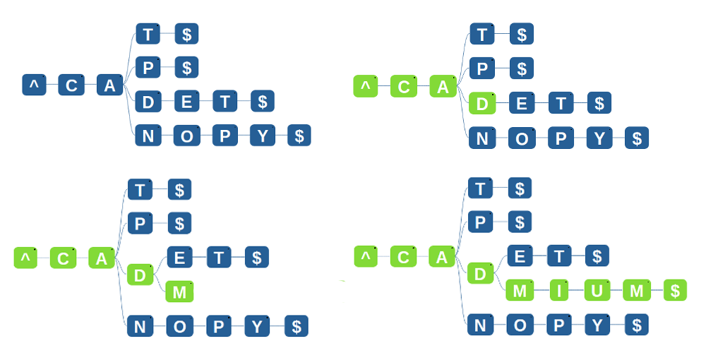 - Convert any given string [WORD] into [^WORD$], where the ^ character denotes start of the word and $ denotes the end of the word. This is important as we have seen in the tries explanation, where one word is the prefix of another, eg. ANT and ANTLER, and we need to find whether ANT is present in the Trie or not.