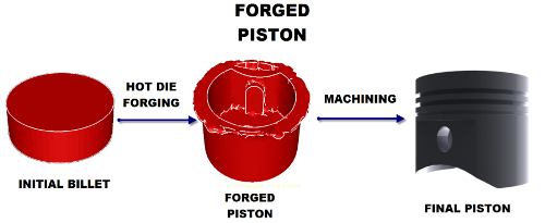 Forged Piston Vs Casted Piston: The majority of original equipment and aftermarket pistons are manufactured through casting. The technical description is 'gravity die casting'. However for the sake of simplicity, a cast piston is manufactured by pouring molten aluminium /silicon alloy into a mold. Forged pistons differ fundamentally in manufacturing and inherent character. As opposed to casting, the forging process basically takes a lump of billet alloy and stamps the shape of the piston from a die.