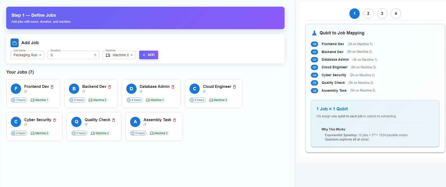 Each job is also mapped to a qubit, meaning 1 job corresponds to 1 qubit in the quantum model.