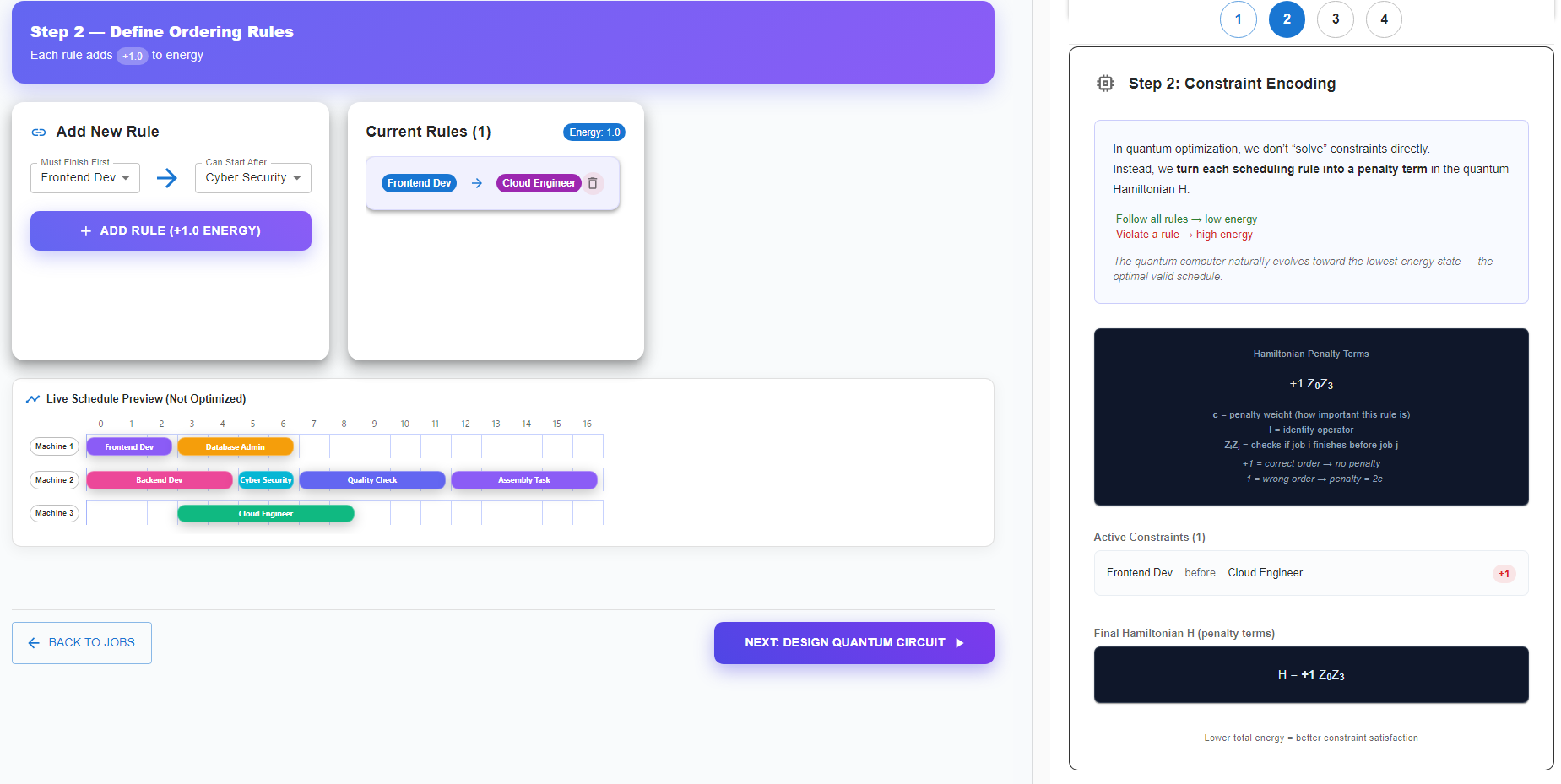 In this step, a parameterized quantum circuit (ansatz) is created to represent possible scheduling solutions.