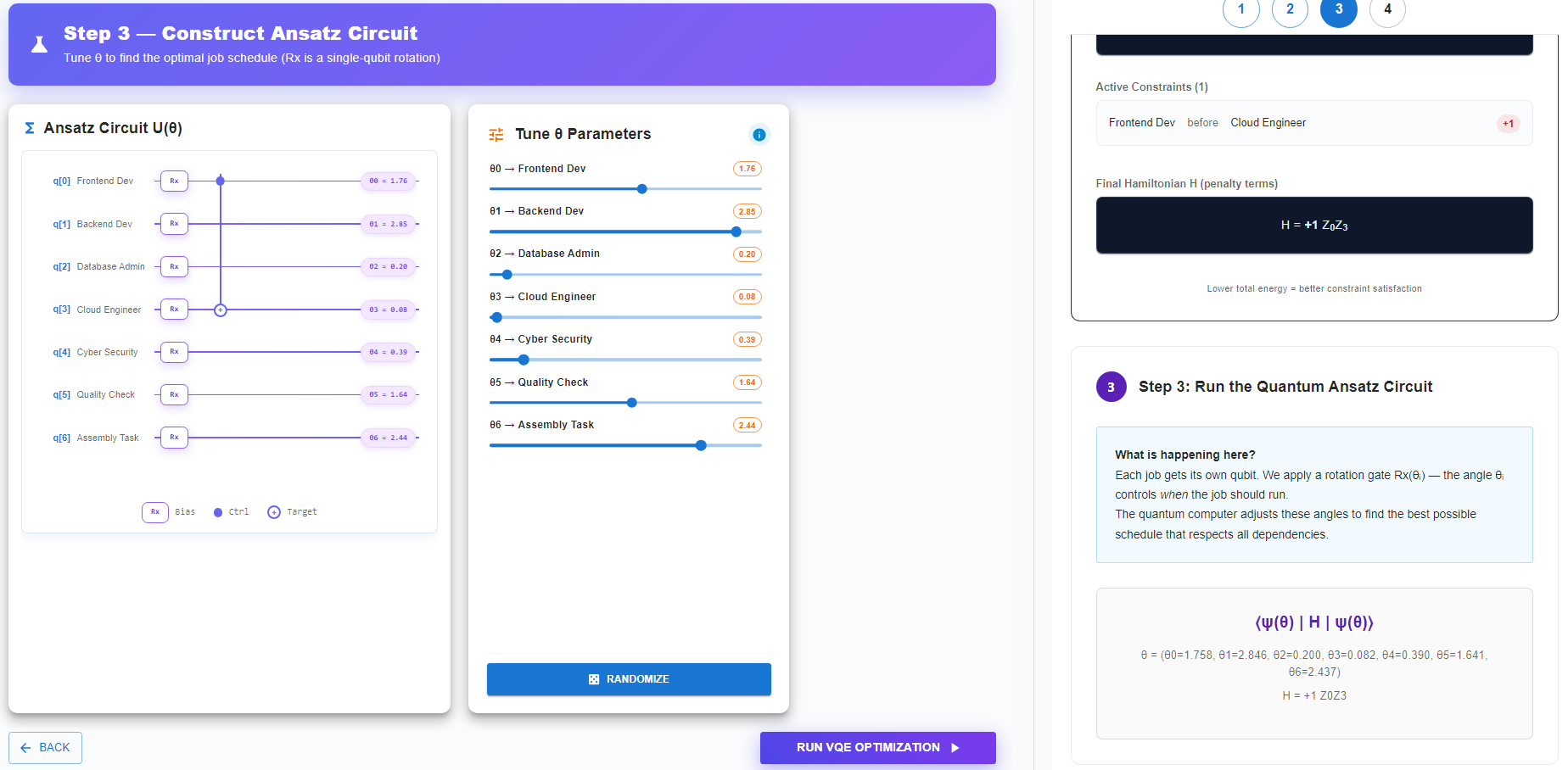 Click Run VQE Optimization to start the process.