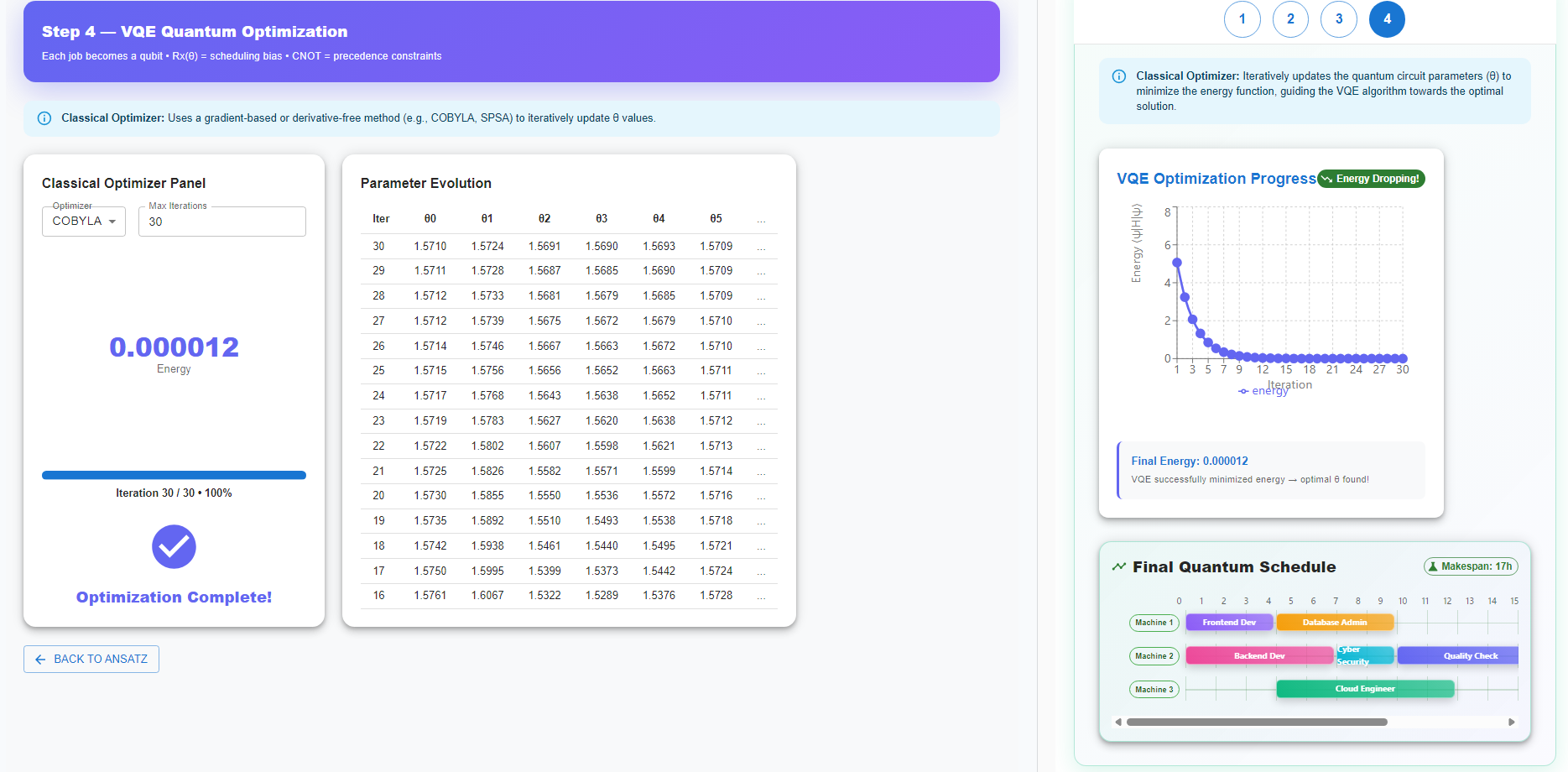 Finally, run the Variational Quantum Eigensolver (VQE) to find the optimal schedule.