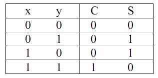 From the verbal explanation of a half adder, we find that this circuit needs two binary inputs and two binary outputs. The input variables designated the augend and addend bits; the output variables produce the sum and carry. We assign symbols x and y to the inputs and S (for sum) and C (for carry) to the outputs. The truth table for the half adder is listed in Table 1. The C output is 1 only when both inputs are 1. The S output represents the least significant bit of the sum.