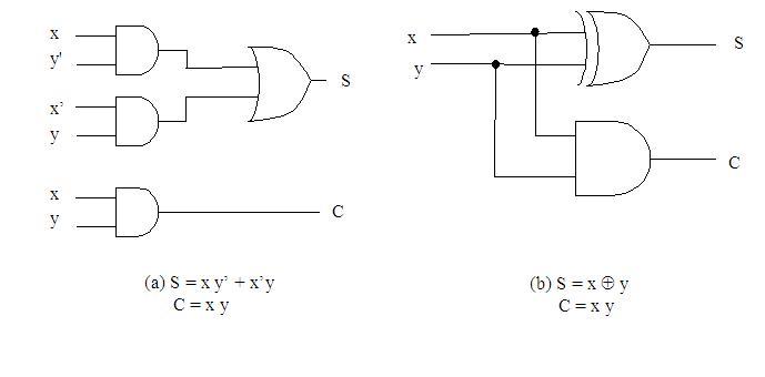 The logic diagram of the half adder implemented in sum of product is shown in fig. 1(a). It can be also implemented with an exclusive-OR and AND gate as shown in fig. 1(b). This form is used to show that two half adders can be used to construct a full adder.