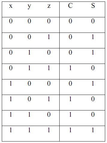 A full adder is a combinational circuit that forms the arithmetic sum of three bits. It consists of three inputs and two outputs. Two of the inputs variables, denoted by x and y, represent the two significant bits to be added. The third input, z, represents the carry from the previous lower significant position. Two outputs are necessary because the arithmetic sum of three binary digits ranges in value from 0 to 3, and binary 2 or 3 needs two digits. The two outputs are designated by the symbols S for sum and C for carry. The binary variable S gives the value of the least significant bit of the sum. The binary variable C gives the output carry. The truth table of the full adder is listed in table 2. The eight row under the input variables designate all possible combinations of the three variables. The output variables are determined from the arithmetic sum of the input bits. When all input bits are 0, the output is 0. The S output is equal to 1 when only one input is equal to 1 or when all three inputs are equal to 1. The C output has a carry of 1 if two or three inputs are equal to 1.