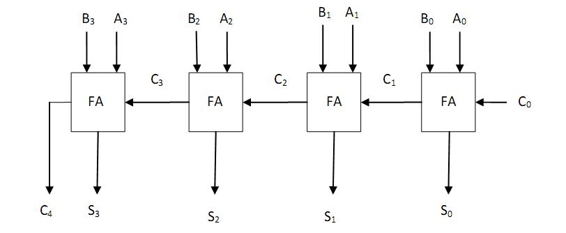 The bits are added with full adders, starting from the position to form the sum bit and carry. The input carry C0 in the least significant position must be 0. The value of Ci+1 in a given significant position is the output carry of the full adder. This value is transferred into the input carry of the full adder that adds the bits one higher significant position to the left. The sum bits are thus generated starting from the rightmost position and are available for the correct sum bits to appears at the outputs.