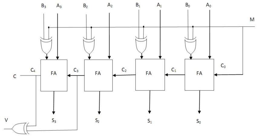The addition and subtraction operations can be combined into one circuit with one common binary adder. This is done by including an EX-OR gate with each full adder. A 4-bit adder-subtractor circuit is shown in fig 4. The mode input M controls the operation. When M = 0, the circuit is an adder, and when M = 1, the circuit becomes a subtractor. Each EX-OR gate receives input M and one of the inputs of B. when M = 0, we have B (Ex-OR) 0 = B. the full adder receive the value of B, the input carry is 0, and the circuit performs A plus B. when M = 1, we have B (Ex-OR) 1= B' and C0 = 1. The B inputs are complemented and a 1 is added through the input carry. The circuit performs the operation A plus the 2's complement of B. (The EX-OR with output is for detecting an overflow.)