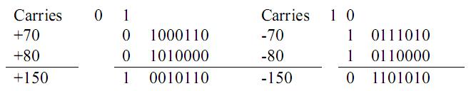 An overflow cannot occur after an addition if one number is positive and the other is negative, since adding a positive number to a negative number produces a result which is than the larger of the two original numbers. An overflow may occur if the two numbers are both positive and both negative. To see how this can happen, consider the following example. Two signed binary numbers, +70 and +80, are stored in two 8-bit registers. The range of numbers that each register can accommodate is from binary + 127 to binary -128. Since sum of the two numbers is + 150, it exceeds the capacity of an 8-bit register. This is true if numbers are both positive or both negative. The two additions in binary are shown next, together with the last two carries;