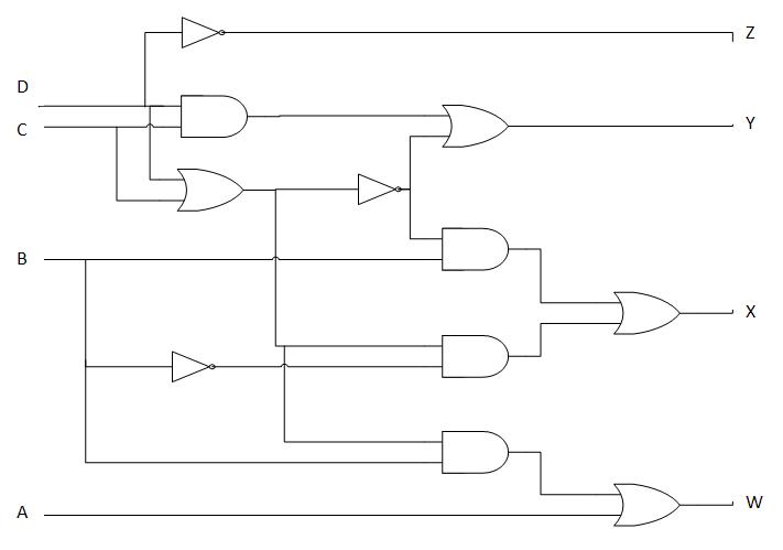 z = D y = CD+C'D'=CD(C+D)' x = B'C+B'D+BC'D'= B'(C+D) +BC'D' x = B'(C+D) +B(C+D)' w = A+BC+BD=A+B(C+D)