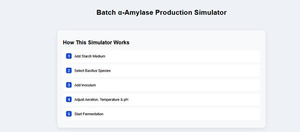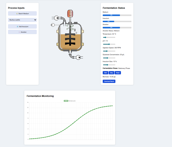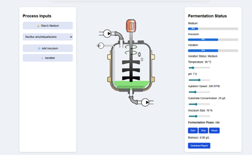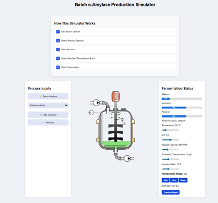 - Users can open the simulator window from the virtual bioreactor simulation experiment. The GUI provides an interactive page foe Batch α-Amylase Production Simulator. The screen was displayed with a central bioreactor (fermenter) model, process inputs panel (left), fermentation status panel (right) and a fermentation Monitoring graph (bottom).