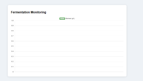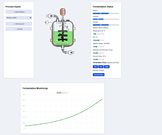 - Click on the Start button to begin the fermentation simulation, and the system enters the Exponential Phase, indicating active microbial growth. Also, the GUI allows the users to monitor biomass production from the fermentation monitoring graph, which indicates biomass increases over time, microbial growth and enzyme production efficiency.