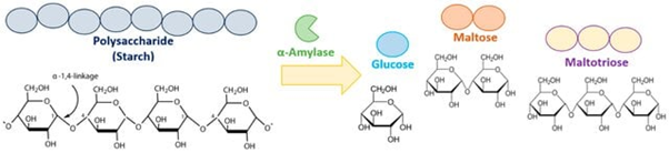 Figure 1. Hydrolysis of starch by alpha amylase to produce glucose, maltose and maltotriose
