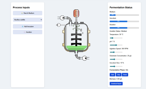 For aerobic batch fermentation processes, e.g., α-amylase fermentation using Bacillus sp, oxygen transfer becomes a critical rate-limiting factor. Oxygen transfer rate and oxygen uptake rate must be in balance to keep the system metabolically active. Agitation in terms of RPM and aeration rate has a direct impact on the volumetric mass transfer coefficient (kLa). Oxygen availability, in turn, affects the metabolism of the cells, ATP generation, and hence the enzyme productivity. Batch fermentation is limited by lower volumetric productivity compared to fed batch and continuous fermentation. The requirement of downtime between cycles to clean, sterilize, and re-inoculate reduces the system efficiency. The vlab simulator (Fig.3) provides a controlled framework of batch fermentation to observe the effect of various parameters, like temperature, pH, aeration, agitation speed, substrate concentration, and inoculum size, on microbial growth and α-amylase production.