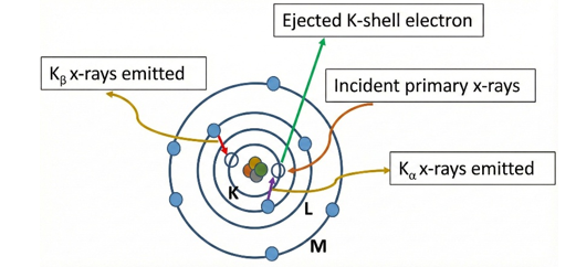 • Kβ radiation: Produced when an electron from the M-shell fills a vacancy in the K-shell.