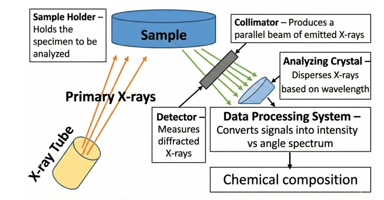 - Analyzing Crystal – Disperses X-rays based on wavelength.
