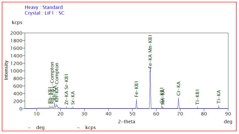 Each sharp peak corresponds to characteristic radiation from a specific element (e.g., Fe Kα, Cr Kα, Ti Kα). The peak position indicates the element (qualitative analysis), while peak intensity indicates its amount (quantitative analysis). Background radiation arises due to scattering effects such as Compton and Rayleigh scattering.